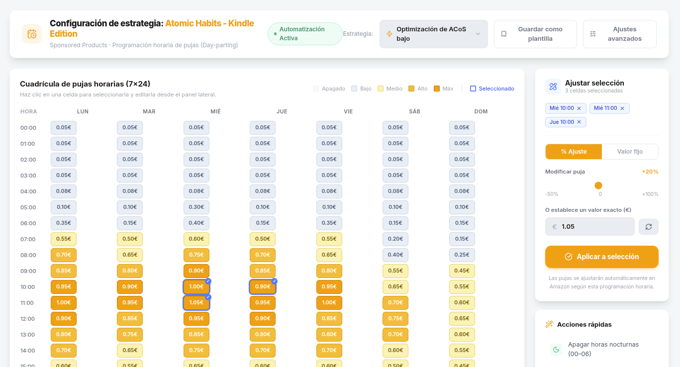 Olvida descifrar informes de Amazon Ads. Identificamos tus horas de máxima venta para que optimices tus campañas sin ser un experto en datos.