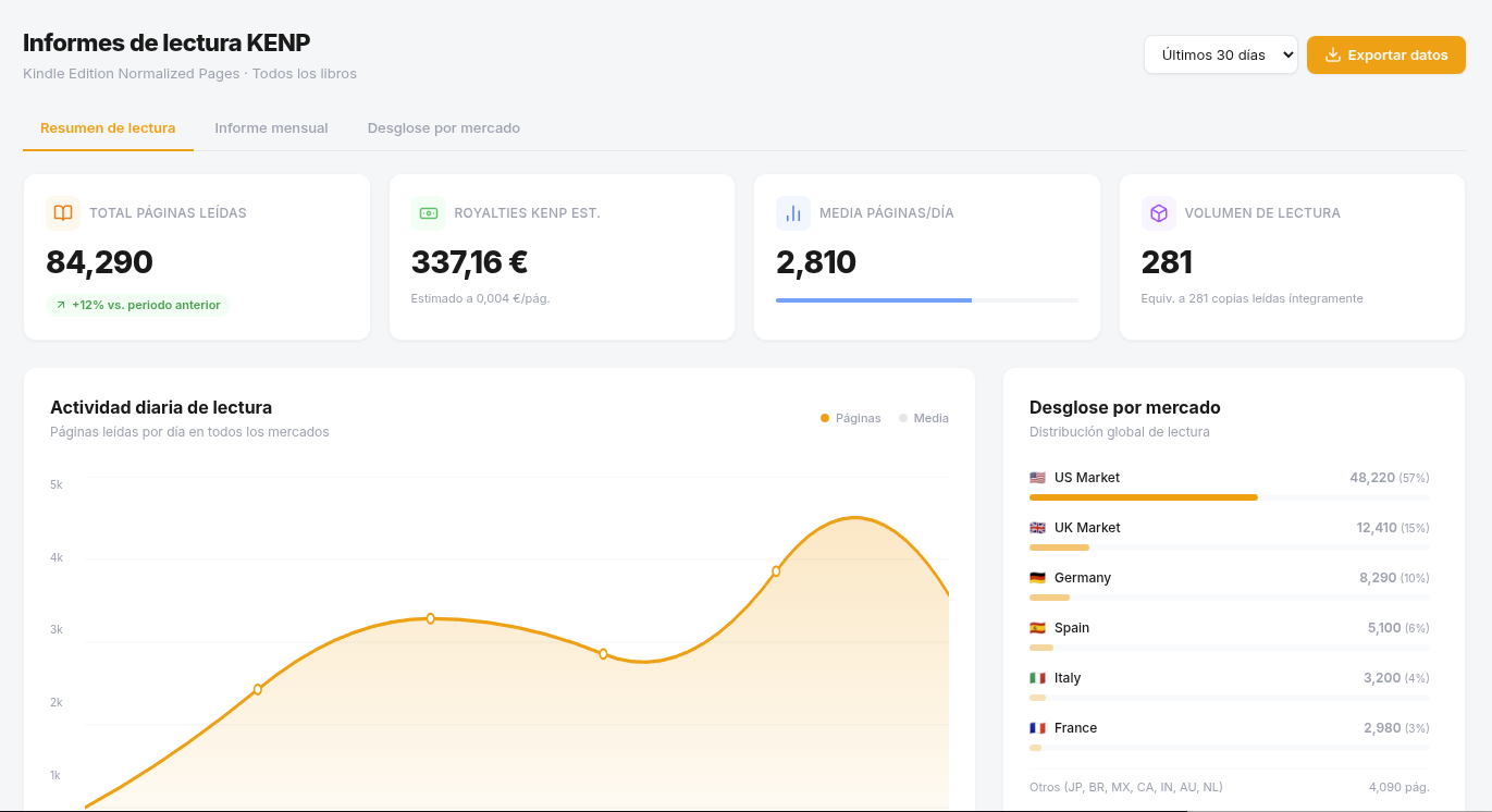 No pierdas tiempo descifrando informes complejos. Te mostramos el volumen de páginas leídas de forma visual y sencilla para que entiendas, de un vistazo, el impacto real de tu publicidad en Kindle Unlimited.
